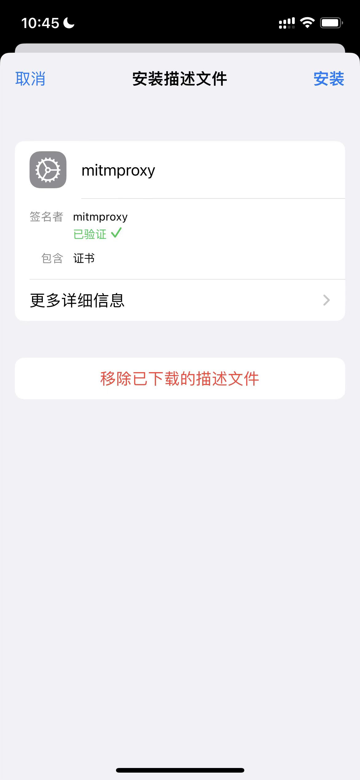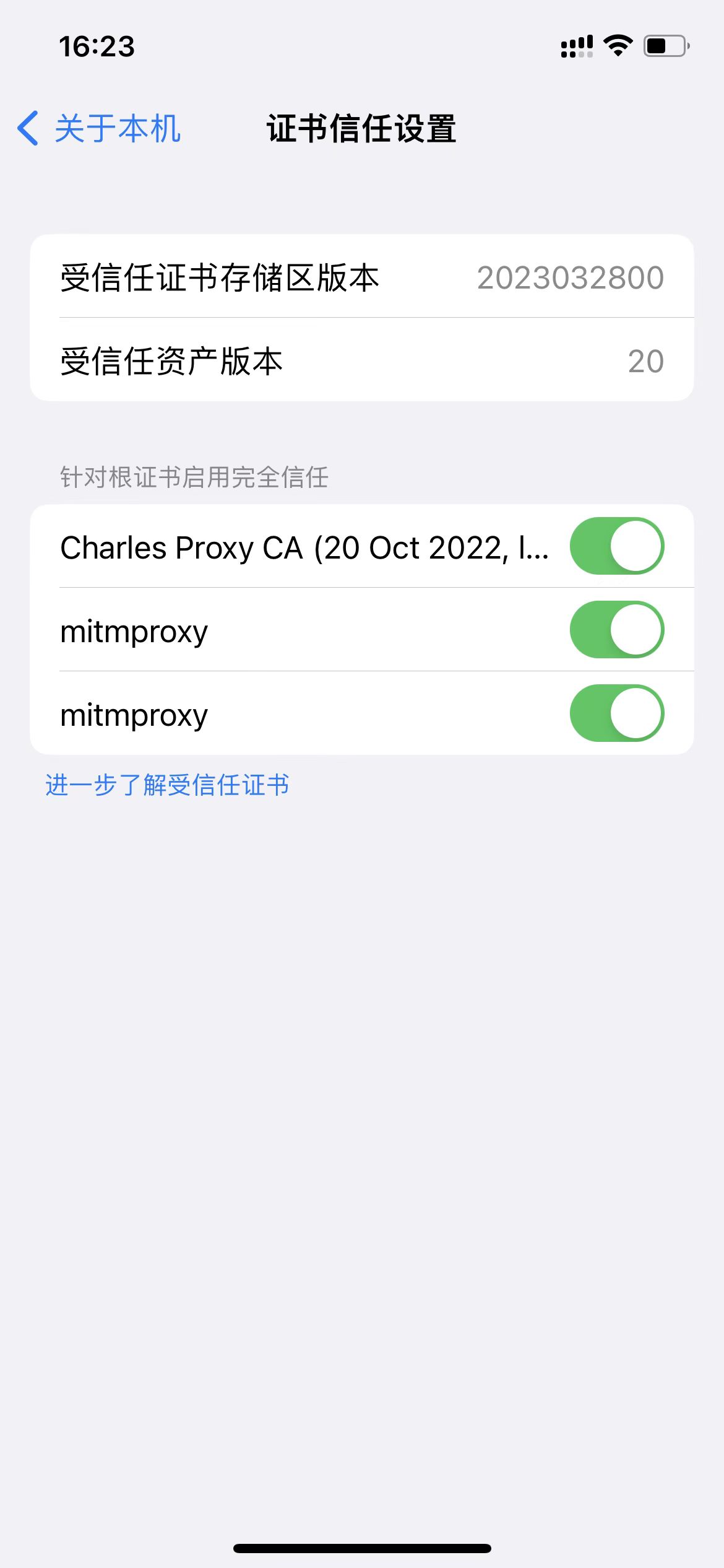 iOS >= 10.3信任CA证书,除了上述证书安装过程,还需要在 设置->通用->关于本机->证书信任设置 中把MitmProxy证书的开关打开。